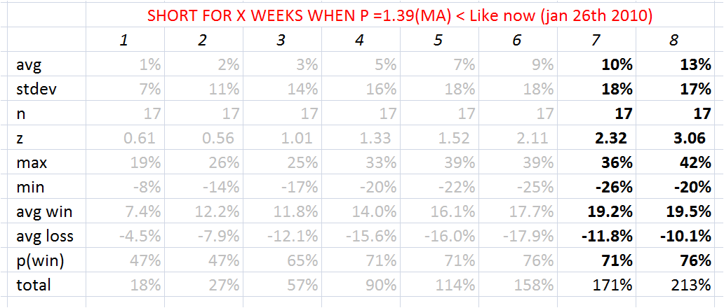 Uncategorized Short the bull in SB Posted on January 26, 2010 by joachin In a 8 week span I should sell sugar and expecting to gain 20% to twenty percent with possible losses of about 18% to 26%. The probability of loss is of 24%. The problem is this has happened before only 17 times since 1967… Share this: Click to share on Facebook (Opens in new window) Facebook Click to share on X (Opens in new window) X Like Loading... Related