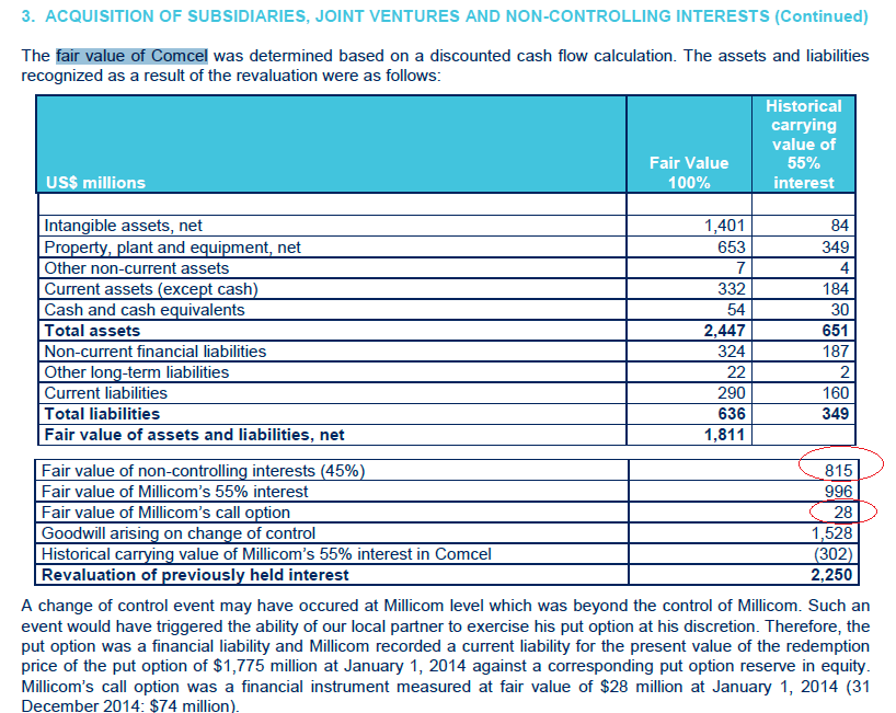 - Millicom se esta expandiendo en Africa (excepto en el Congo) y Colombia; pero a Dic 2015 tenía el derecho (pero no obligación) de tomar control total de Comcel a través de una exposición en derivados financieros: Un call option de $28 millones para un subyacente valorado en $815 millones: