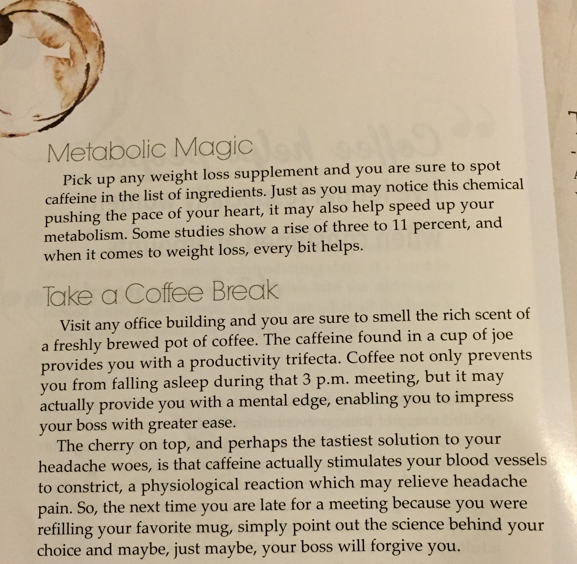 ¿Coffee break? de acuerdo con el Coffee Buró de USA, el Coffee break se instituyó para drogar a los empleados. Si, para que trabajarán más ya que la cafeína estimula el sistema nervioso central. Además: no sólo se mezcla con leche sino con el ejercicio — mucho ejercicio: