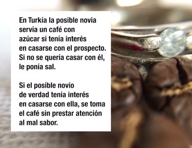 Quizás, junto al vino, es de lo más antiguo que se consume en los últimos 1000 años: En la cultura occidental con el pretexto de un café lo que empieza en cita semi-romántica llega a convertirse en un matrimonio. Pero en la cultural oriental el estilo es más interesante. Hay una tradición turca que va así: